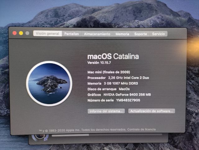 Detalles del productoSe vende un Mac mini modelo 4324A en estupendo estado. Completamente operativo, incluida la superdrive. Core2Duo 2,26Ghz, 3GB de RAM, 320GB disco duro. Se entrega en su embalaje completo, con DVD de aplicaciones, (no incluye el de SO). Adaptador VGA, adaptador HDMI, alimentador CA, teclado, ratón y mando a distancia originales en muy buen estado.