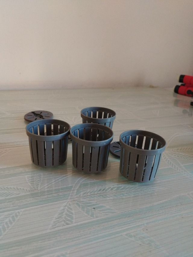 Detalles del productoConjunto de cuatro macetas pequeñas de plástico gris, ideales para acuarios o hidroponía. Su diseño ranurado permite un buen flujo de agua y nutrientes.