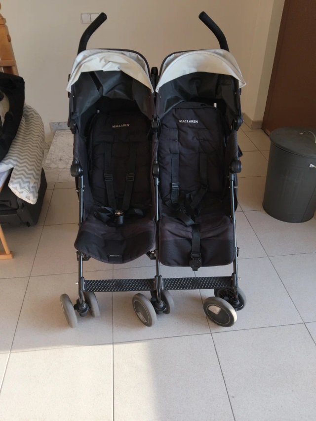 Carro doble de la marca Maclaren, ideal para gemelos o hermanos con poca diferencia de edad. Su diseño es práctico y funcional.