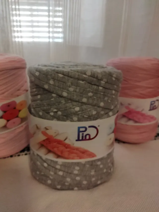 Detalles del productoLote de madejas de trapillo con un divertido estampado de lunares blancos sobre fondo gris.