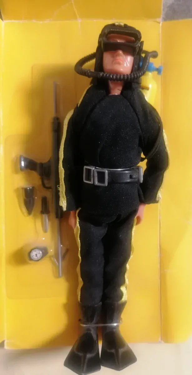 Figura de Madelman con traje de buzo. De Altaya está nuevo, sin la caja exterior. - Traje negro con detalles amarillos. - Incluye equipo de buceo. - Accesorios. - Aletas.