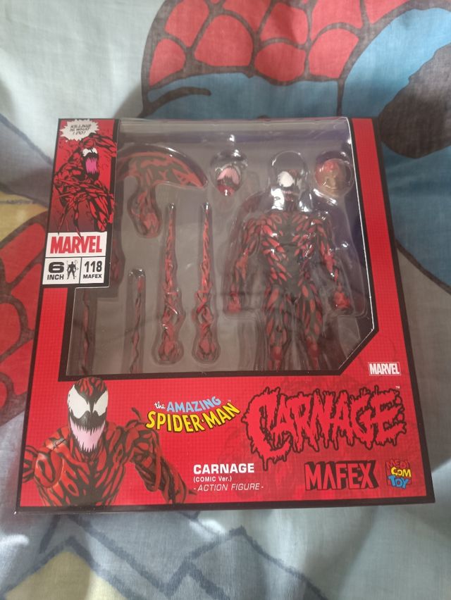 Figura de acción Mafex Carnage (versión cómic) número 118 de Medicom Toy. ¡Impecable! Incluye accesorios. - Figura articulada de Carnage. - Accesorios incluidos: hacha y otras armas. - En su caja original.
