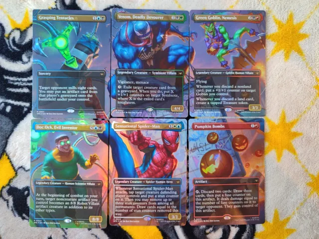 Detalles del productoColección de cartas raras foil de Magic The Gathering con temática de Spiderman.