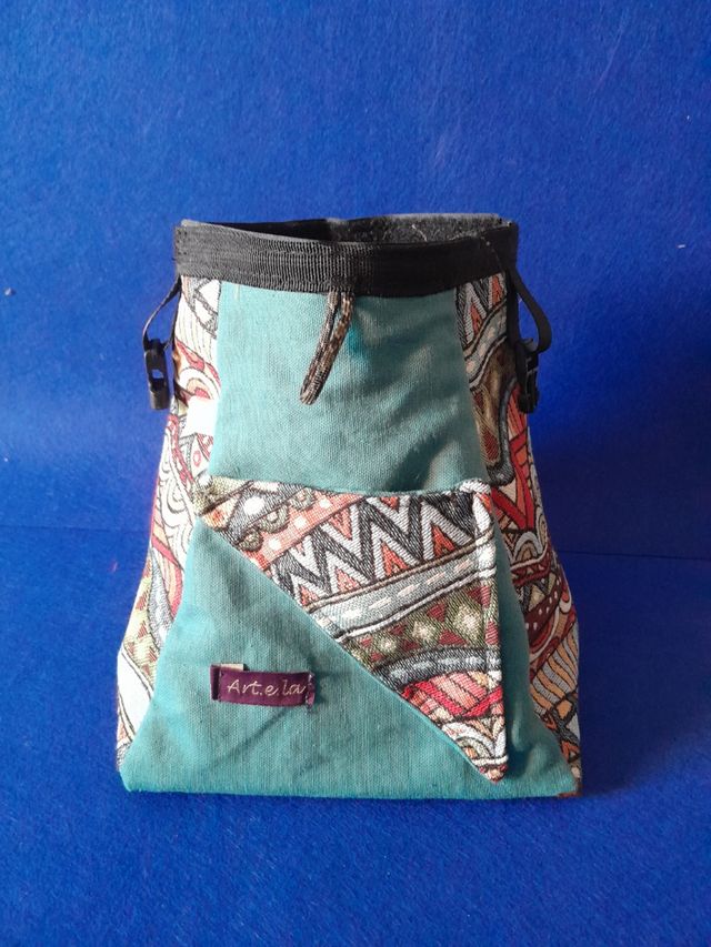 Detalles del productoMagnesera artesanal diseñada y creada para escalar en rocodromos o boulder, hecha a mano con máquina de coser. Doble tela, una interior de pelo que ayuda a sujetar el magnesio y otra tela exterior dura y resistente. ✔️Base de cuero sintético. ✔️Cierre de velcro y cierre envolvente con hebillas. ✔️Bolsillo lateral y goma para guardar cepillo, cinta, etc.