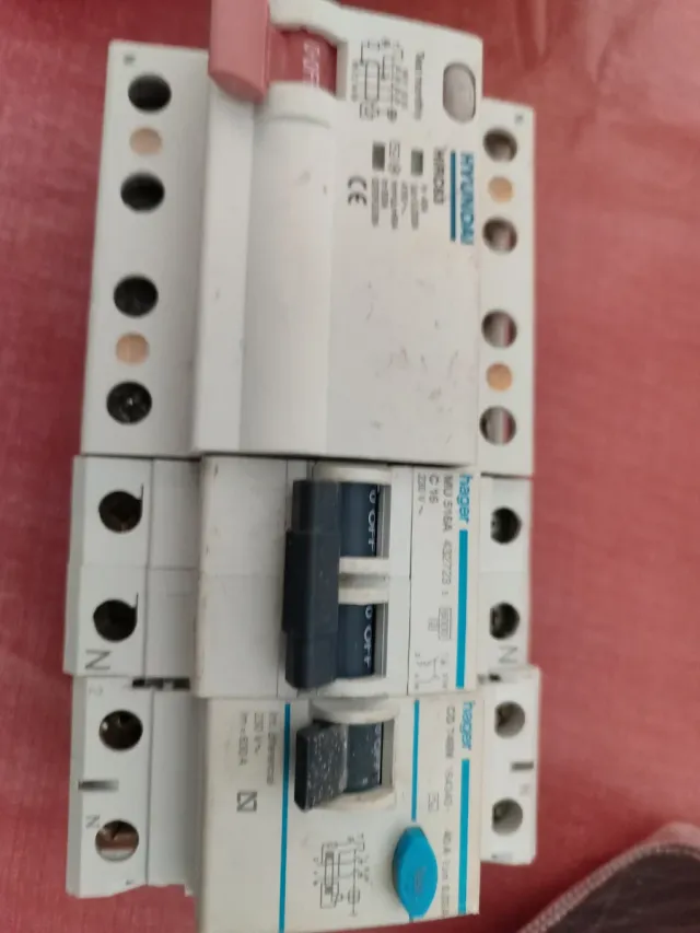 Conjunto de interruptores magnetotérmicos de las marcas Hyundai y Hager. - Interruptor Hyundai HBD3. - Interruptor Hager MU 516A C16. - Interruptor Hager CD 740N 40A.