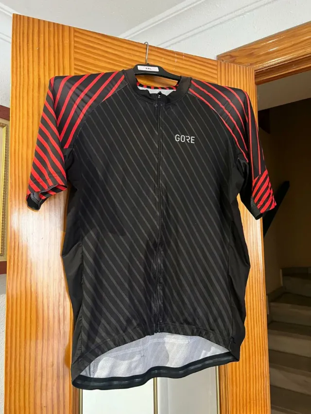 Maillot de ciclismo de la marca GORE. - Color negro con detalles de rayas rojas. - Diseño con cremallera frontal. - Tejido ligero y transpirable.