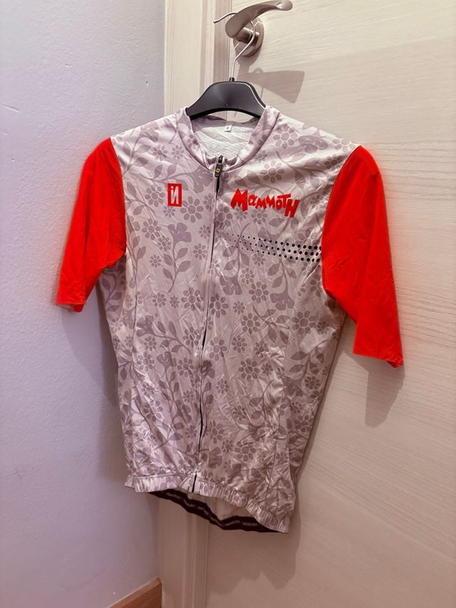 Detalles del productoMaillot de ciclismo para mujer de manga corta de la marca Inverse. Presenta un diseño floral en tonos grises y mangas de color naranja.