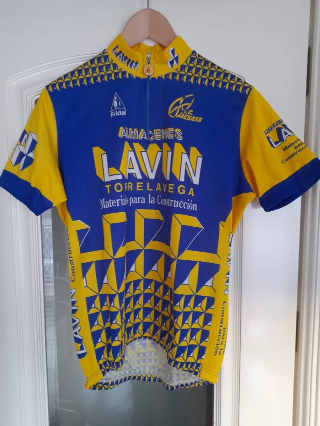 Detalles del productoMaillot de ciclismo retro del Club Ciclista Besaya. Fabricado en Pais Vasco, marca Fridal. Diseño llamativo en azul y amarillo propio de los años 80, cremallera en el cuello y 3 bolsillos lumbares. Patrocinador: Almacenes Lavin de Torrelavega, marca Fridal, fabricado en el País Vasco.