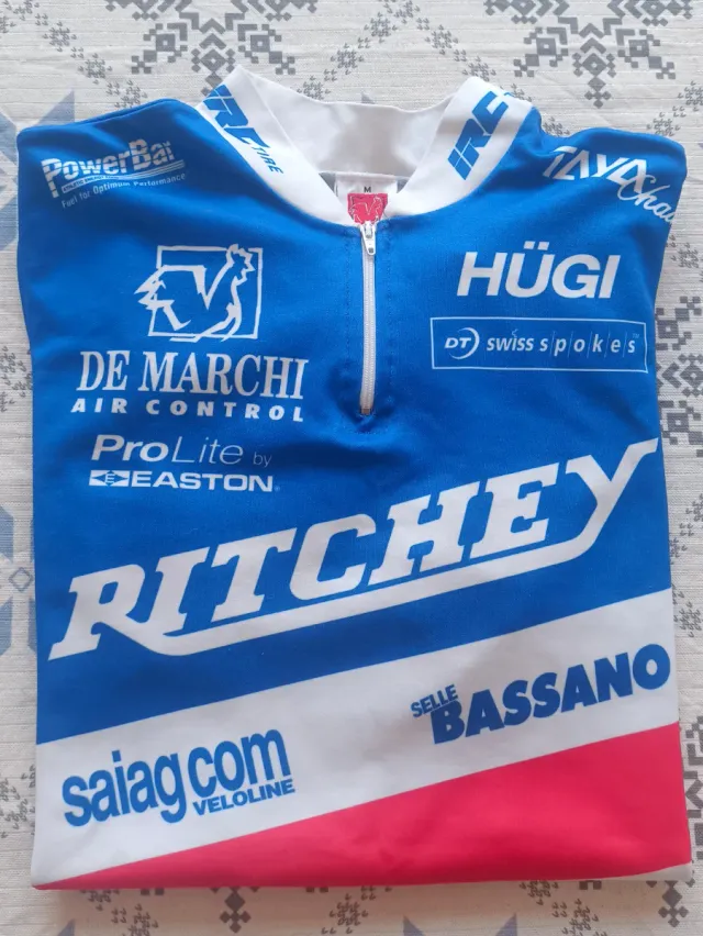 Detalles del productoMaillot de ciclismo vintage de la marca Ritchey, talla M. Diseño en color azul con detalles blancos y rosas.