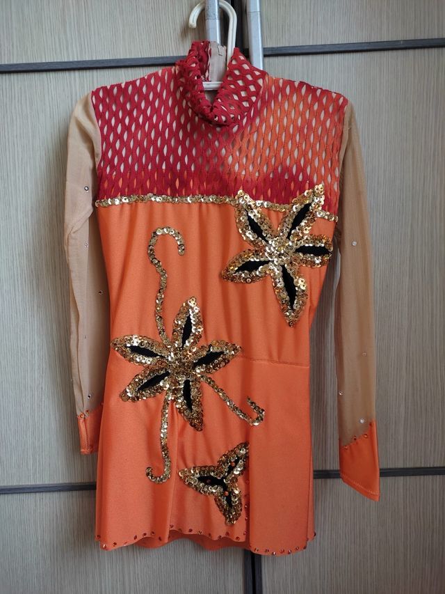 Maillot de gimnasia rítmica o patinaje artístico en color naranja vibrante. Diseñado para destacar en la pista.