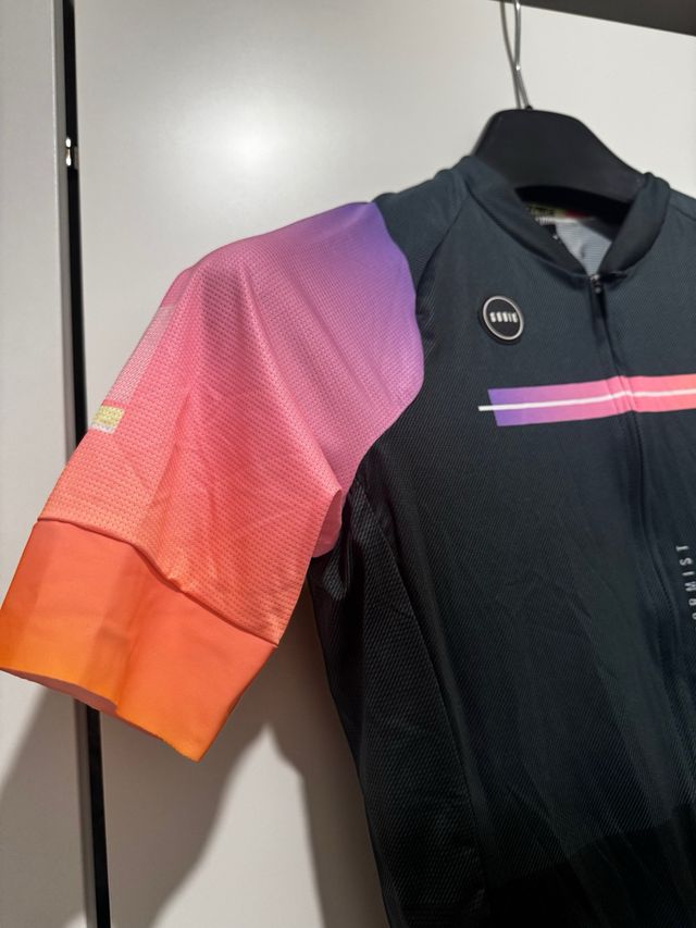 Detalles del productoMaillot de ciclismo GOBIK en talla S. Presenta un diseño degradado en las mangas con tonos rosas, naranjas y morados, contrastando con el cuerpo principal en negro.
