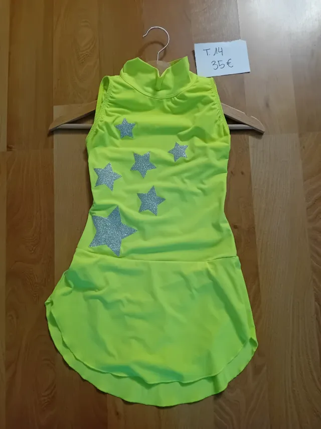Detalles del productoMaillot de patinaje artístico de color verde neón con un divertido estampado de estrellas plateadas brillantes. El cuello es alto y sin mangas, con una falda integrada.