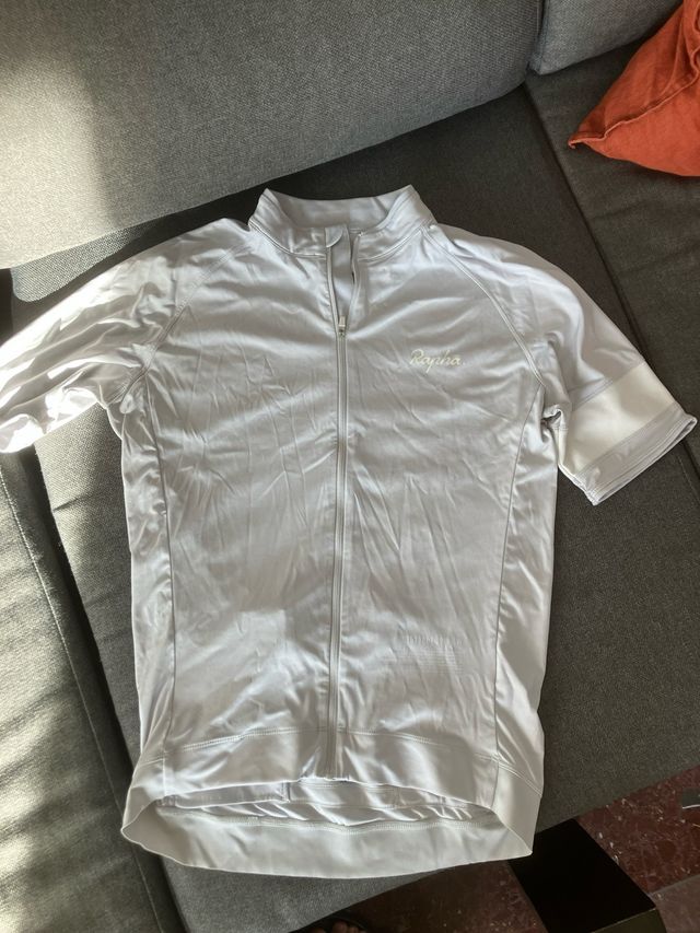 Detalles del productoMaillot de ciclismo Rapha Core de manga corta en talla M. Color gris claro con banda blanca. Muy buen estado general con mucha vida por delante. La goma inferior está en perfecto estado.