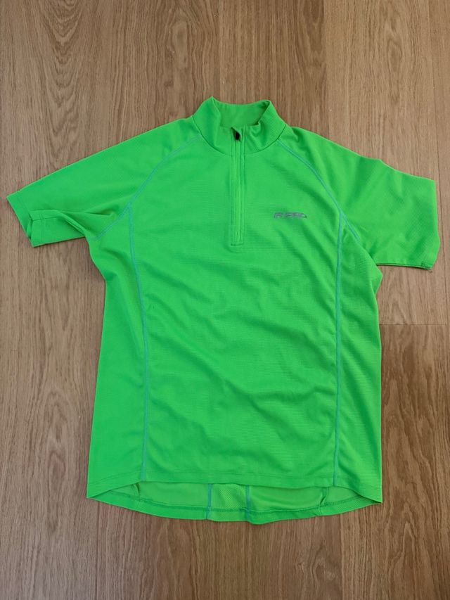 Maillot deportivo de color verde brillante, ideal para actividades al aire libre. - Cremallera frontal. - Costuras en contraste azul. - Tejido técnico.