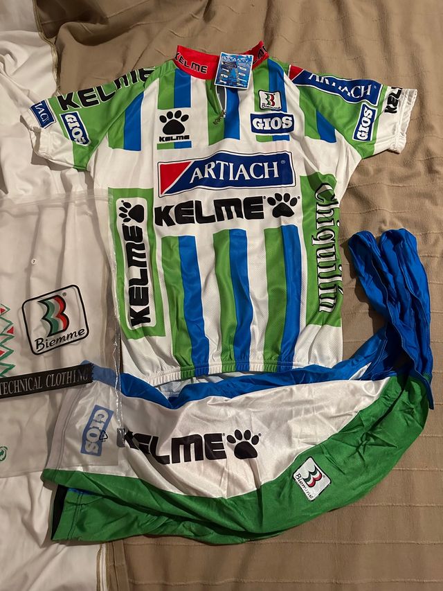 Detalles del productoEquipo ciclista profesional temporada 1996 nuevo en su bolsa de origen montaba bicicleta gios talla l - 50 fabricado en Italia marca biemme