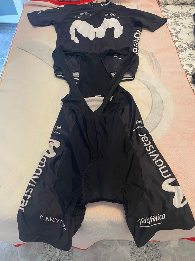 Conjunto de ciclismo del equipo Movistar. - Maillot de manga corta. - Culotte con tirantes. - Diseño negro con logos del equipo y patrocinadores.