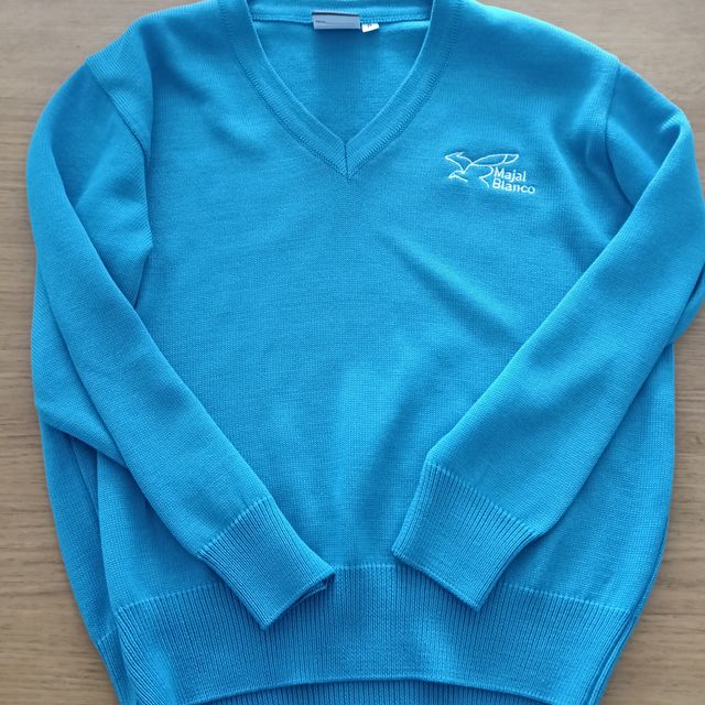Jersey azul con cuello en V de colegio Majal Blanco Talla ocho Impecable - Diseño liso. - Manga larga. - Logo bordado en el pecho.