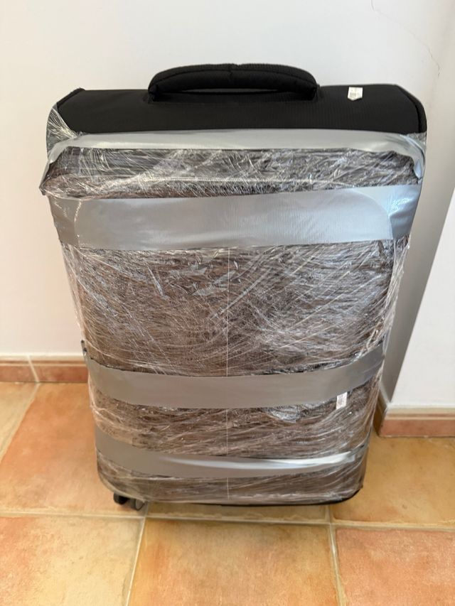 Maleta de viaje envuelta en plástico y cinta adhesiva gris. Contiene ropa usada. - Maleta de tamaño mediano. - Asa superior para transporte. - Ruedas en la base.