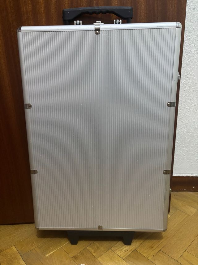 Detalles del productoMaleta plateada con asa superior negra y cierres metálicos. Ideal para guardar y transportar joyas.