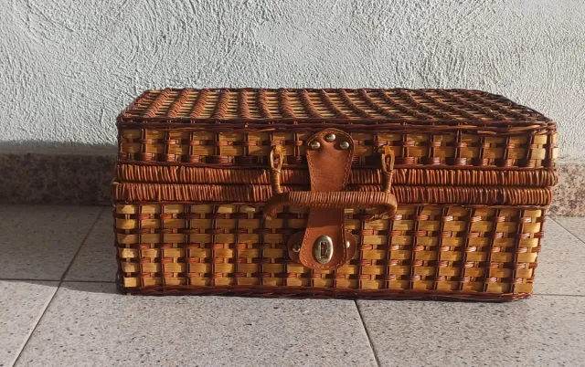 Detalles del productoMaleta de mimbre con cierre y asa de cuero, ideal para camping o picnics.