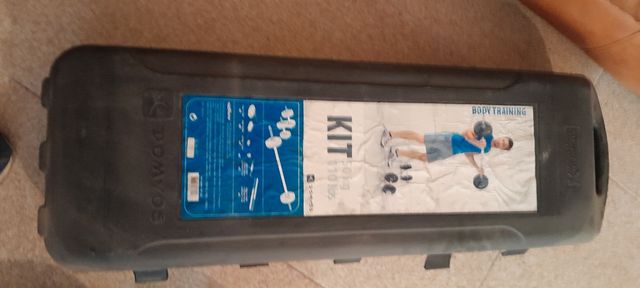 Maleta de pesas con barra de 2 m desmontable,2 mancuernas,6 tuercas ajustables,4 discos de 5 kg,10 discos de 2 kg,4 discos de 0,5 kg,en muy buenas condiciones.
