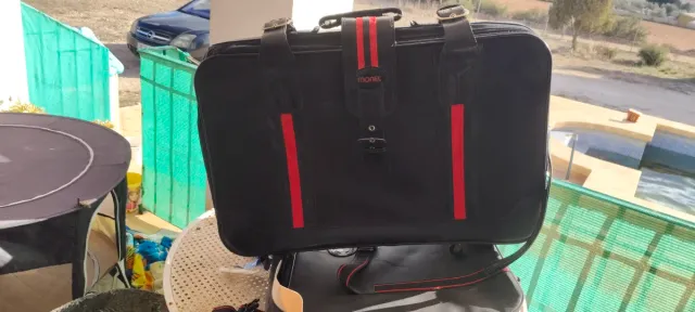 Detalles del productoMaleta de viaje de la marca Monti, en color negro con detalles en rojo.