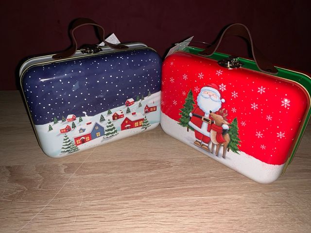 Detalles del productoSet de dos maletas de lata con temática navideña.