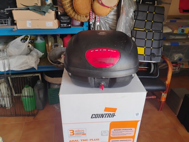 Baúl trasero para moto en buen estado. Es de color negro y tiene un pequeño reflector rojo trasero. Incluye una llave para abrirlo. Se encuentra en perfecto estado