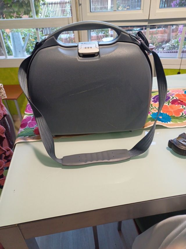 color gris azulado , con departamentos y cajón interiores . con Asa y bandolera. medidas 37x33x17. poco usado pero con una raya en un lateral