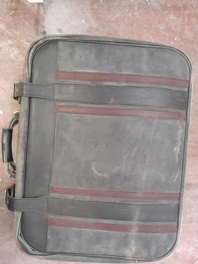 Detalles del productoPreciosa maleta antigua, ideal para decoración o viajes. Es de color gris oscuro y tiene detalles en marrón.