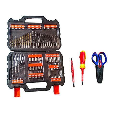 Detalles del productoConjunto de: maletín BLACK and DECKER de 109 piezas, para tener casi todas las brocas, vasos y puntas que pueda necesitar, sin usar. Tijeras WORKPRO para electricista, en acero inoidable, con funda para el cinturón, son nuevas. Destornillador aislado para electricista 500v un mango con 4 puntas, nuevo.