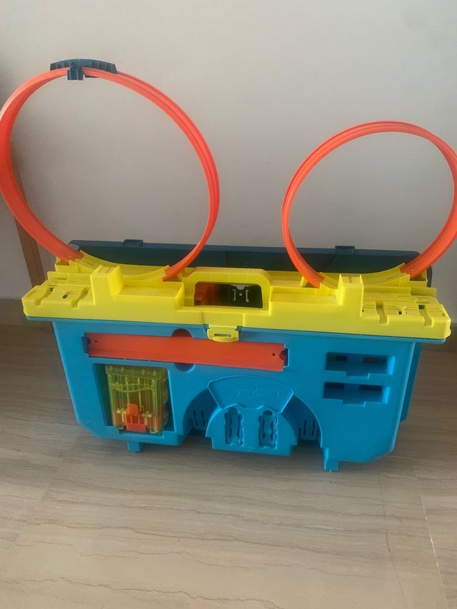 Maletín de juego con circuito de Hot Wheels. Incluye dos pistas de loop. - Color azul y amarillo. - Pistas de color naranja. - Asa para transporte.