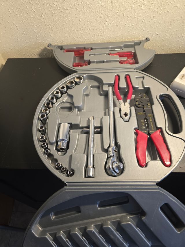 Detalles del productoMaletín de herramientas en buen estado, incluye carraca con vasos, alargadores, alicates, pelacables y destornilladores. Ideal para reparaciones en casa, coche o bricolaje. Fácil de transportar gracias a su estuche rígido con asa.