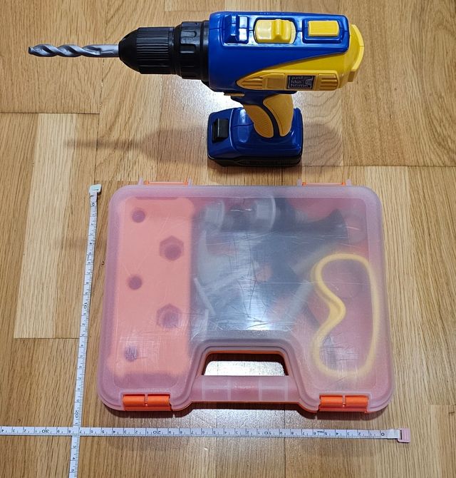 Taladro infantil a batería que funciona perfectamente junto a maletín con los accesorios que se muestran en las imágenes
