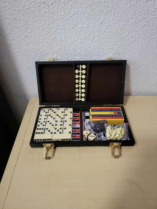Maletín compacto que contiene varios juegos de mesa clásicos. - Dominó con 28 fichas. - Dados. - Piezas de ajedrez y damas. - Marcadores de puntuación.