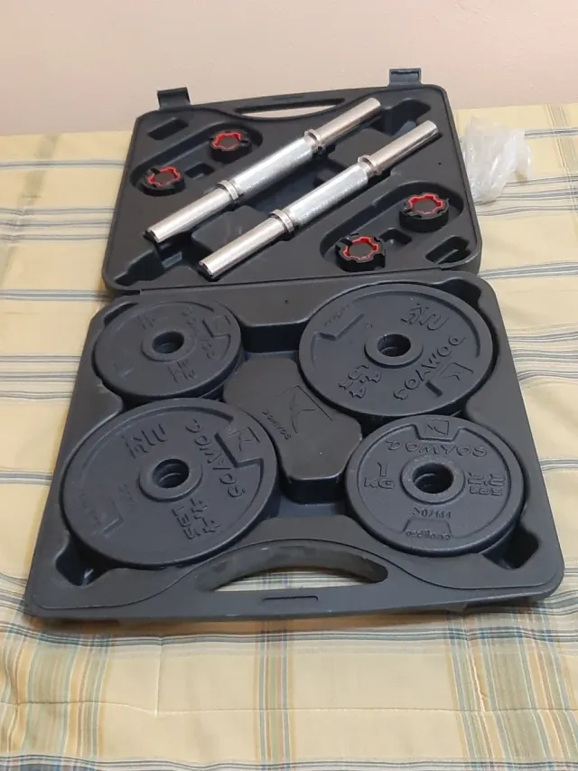Maletín de pesas para entrenamiento en casa. - Incluye dos barras. - Incluye varios discos de diferentes pesos. - Cierre seguro para transportar.