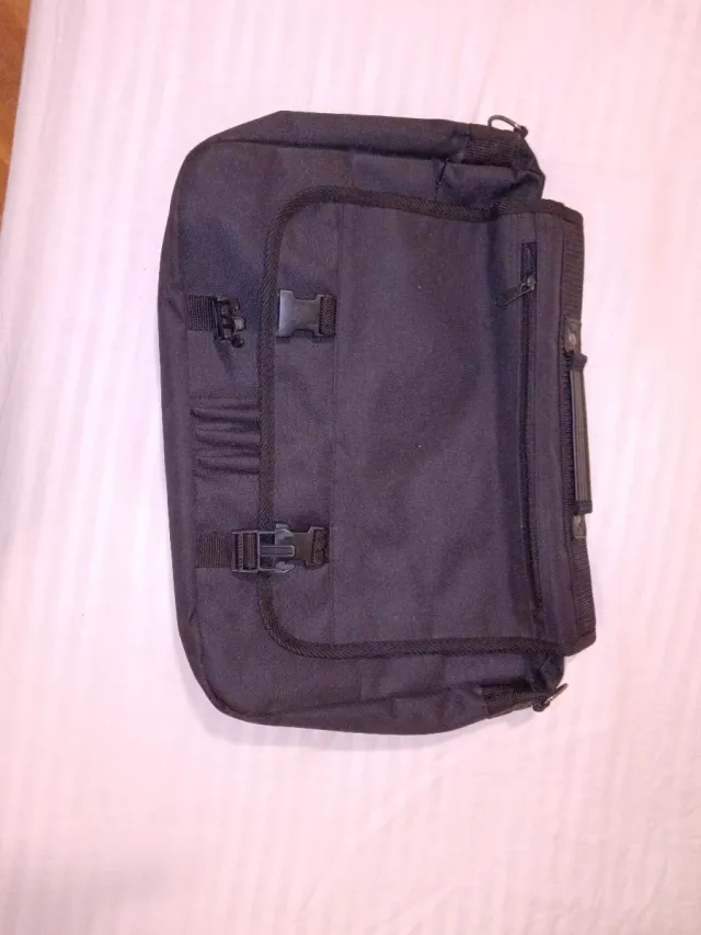 Maletín o funda negra para portátil. Ideal para proteger tu equipo. - Cierre con hebillas. - Asa de mano. - Bolsillo frontal con cremallera.