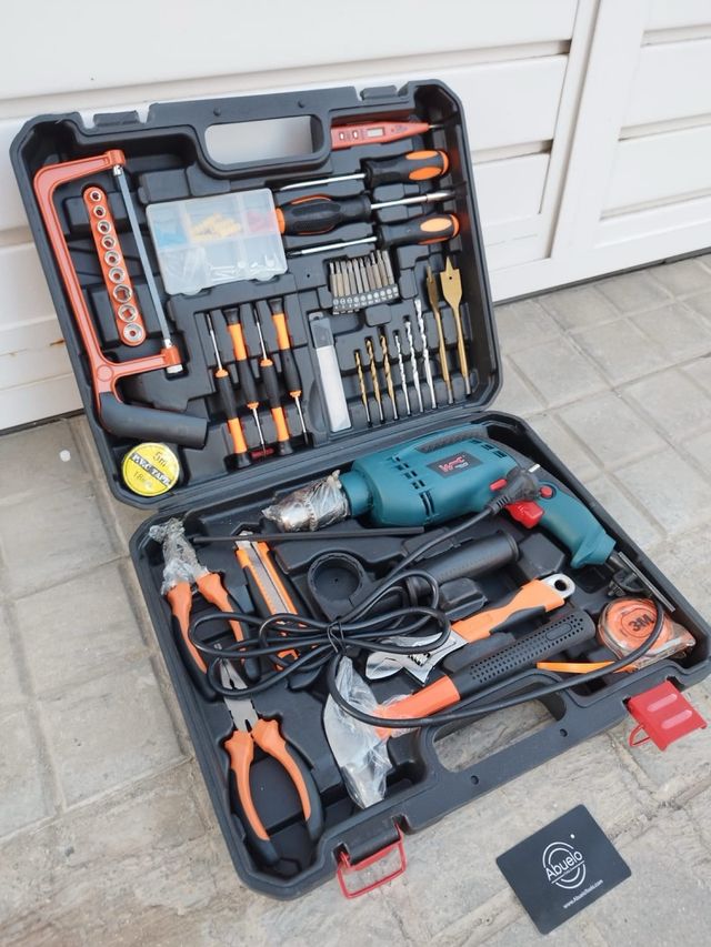 Detalles del productoCompleto maletín de herramientas nuevo sin estrenar con taladro eléctrico y accesorios ; Sierra de arco , Juego de destornilladores , Juego de brocas , Alicates , Martillo , Cinta métrica , Cúter , Llave inglesa , Metro , Medidor eléctrico , Puntas , etc ...
