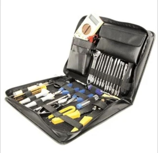 Detalles del productoMaletín de herramientas Stey Accessories para servicio y reparación de ordenadores, con 29 piezas y tester incluido. Contiene destornilladores de precisión, llaves, alicates, pelacables, pinzas, adaptadores, extractor de chips y diferentes puntas para múltiples usos.