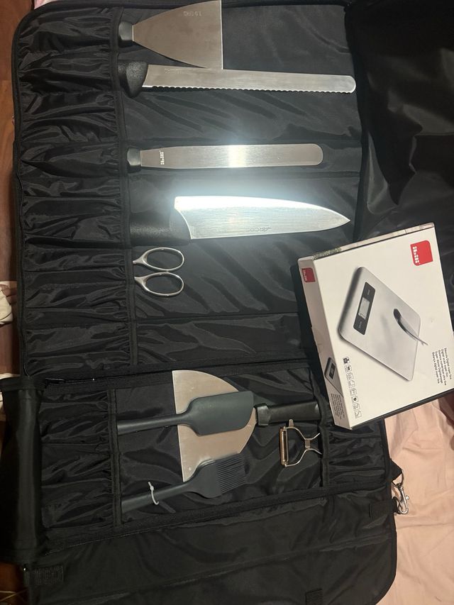 El maletín está en buen estado me lo compre para estudiar hosteleria y pasteleria y por problemas lo deje y nada esta usado esta el maletin nuevo el unico problema que los cuchillos estan grabados