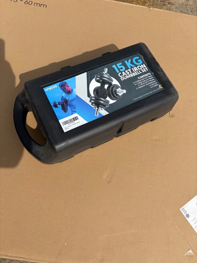 Detalles del productoMaletín de pesas de hierro fundido de 15 kg.