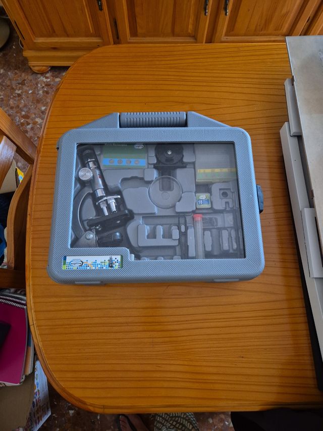 Detalles del productoMaletín de plástico gris con asa para transportar un microscopio y accesorios.