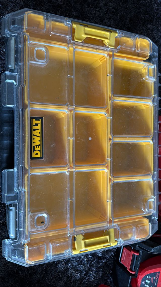 Detalles del productoMaletín organizador de la marca Dewalt con múltiples compartimentos.