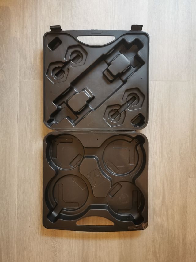 Detalles del productoMaletín de plástico negro diseñado para organizar y transportar discos de pesas y barras. Cuenta con compartimentos moldeados para mantener los discos seguros y ordenados.