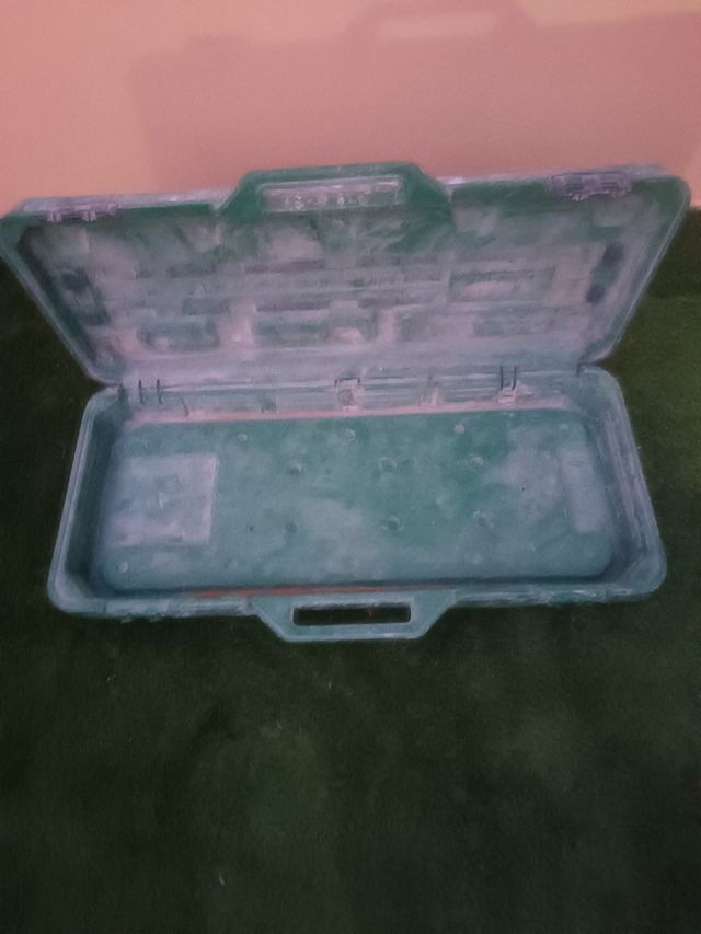 Detalles del productoMaletín de plástico verde para guardar y transportar una máquina de corte de azulejos. Diseñado para proteger el equipo.