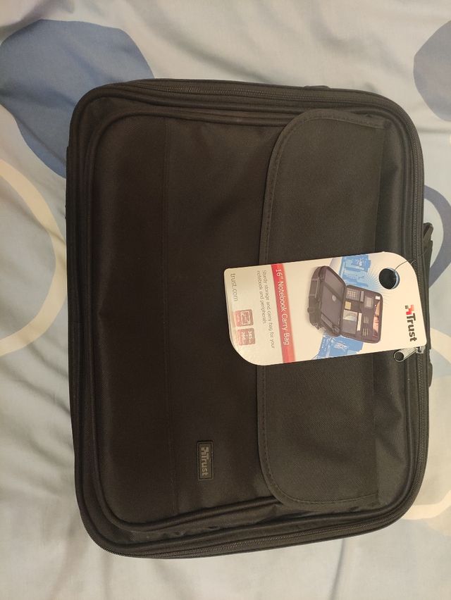 Bolsa para llevar y trasportar portátil 16" Nueva con etiqueta, marca Trust. Negra, correa ajustable para hombro, bolsillos para accesorios. 38,5x26,6 cm