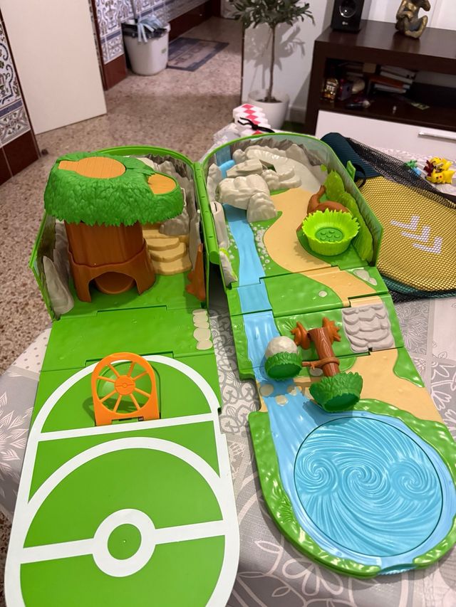 Maletín de juego Pokémon con diseño de paisaje. - Incluye un árbol con entrada y escalones. - Zona de río con cascada y estanque. - Base con diseño de Poké Ball.