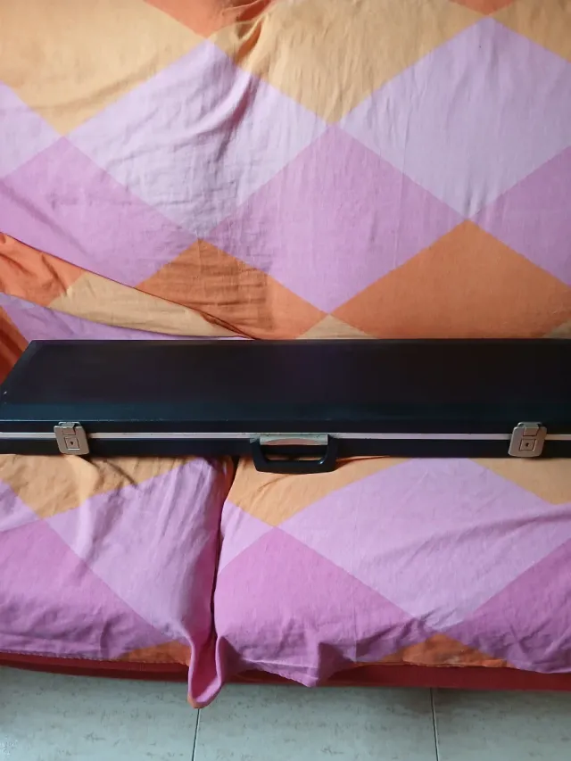 Detalles del productoMaletín rígido de color negro, ideal para transportar armas de forma segura. Cuenta con cierres metálicos y un asa central.