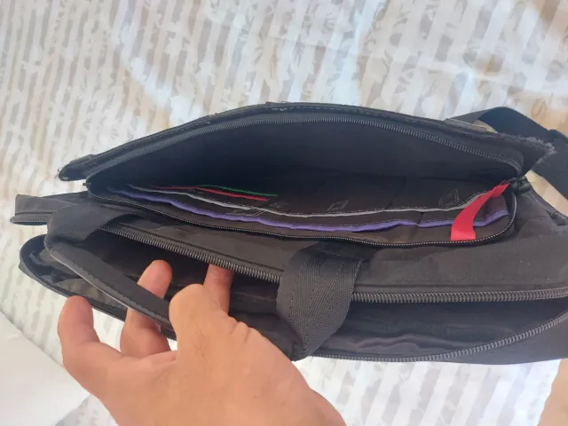Detalles del productoMaletín negro para portátil con varios compartimentos interiores.