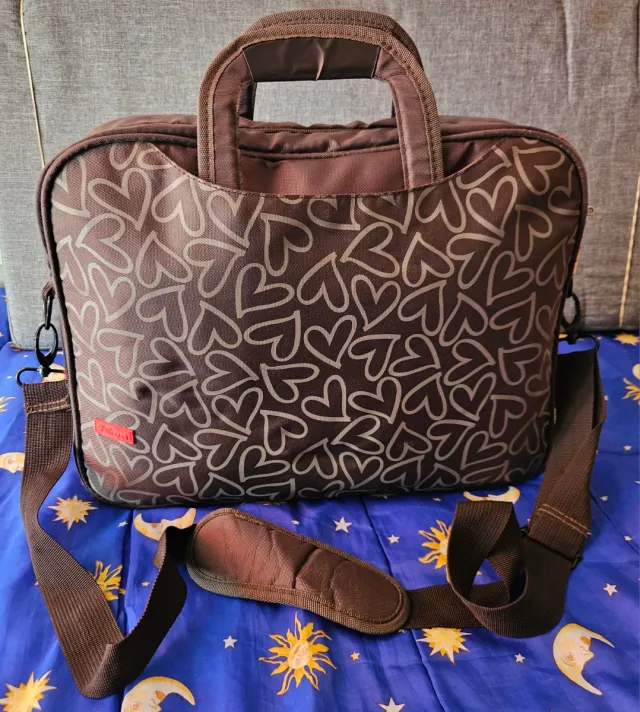 Detalles del productoMaletín para portátil con un divertido estampado de corazones en tonos marrones y grises. Incluye correa ajustable para el hombro.
